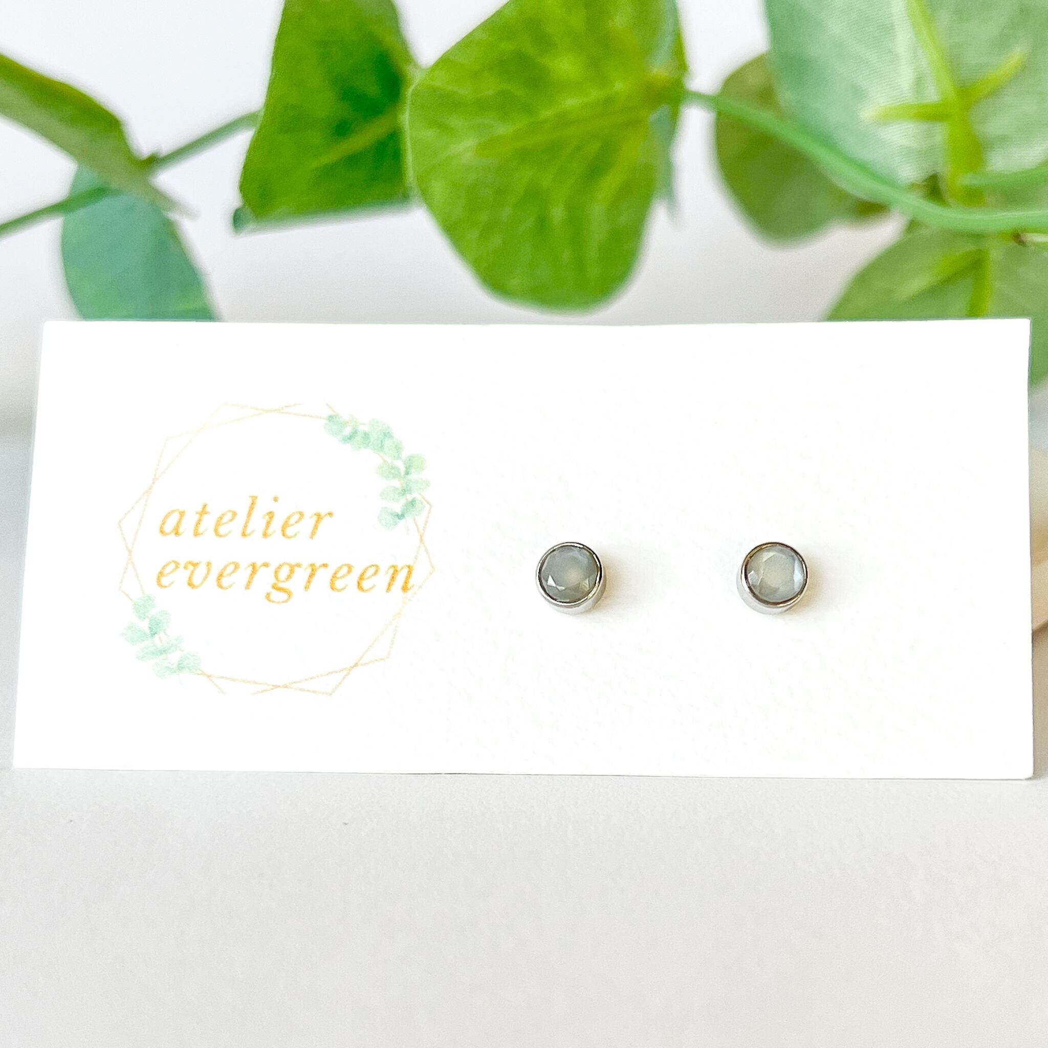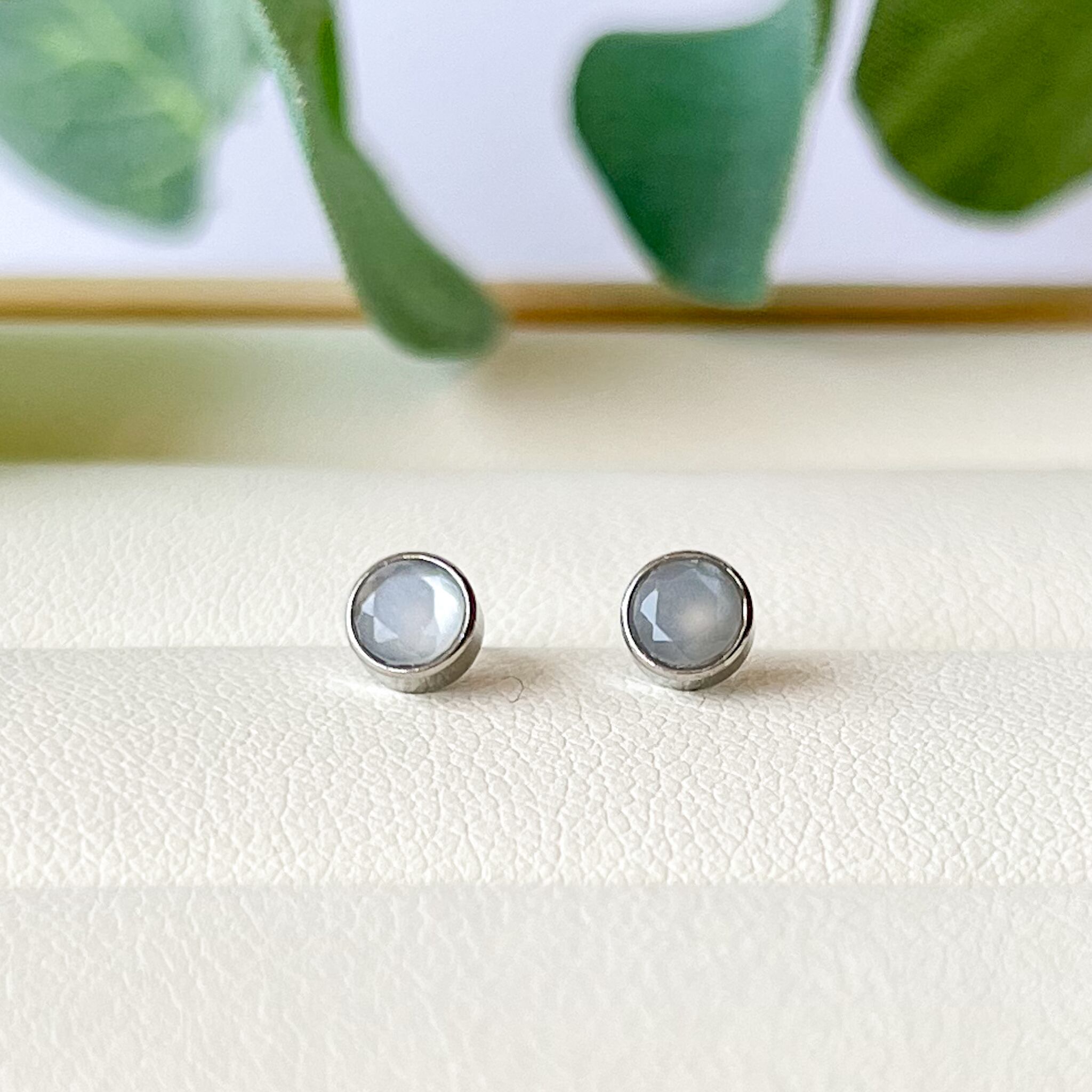 ホワイトムーンストーン×シルバー シンプルベゼルスタッドピアス 金属アレルギー対応