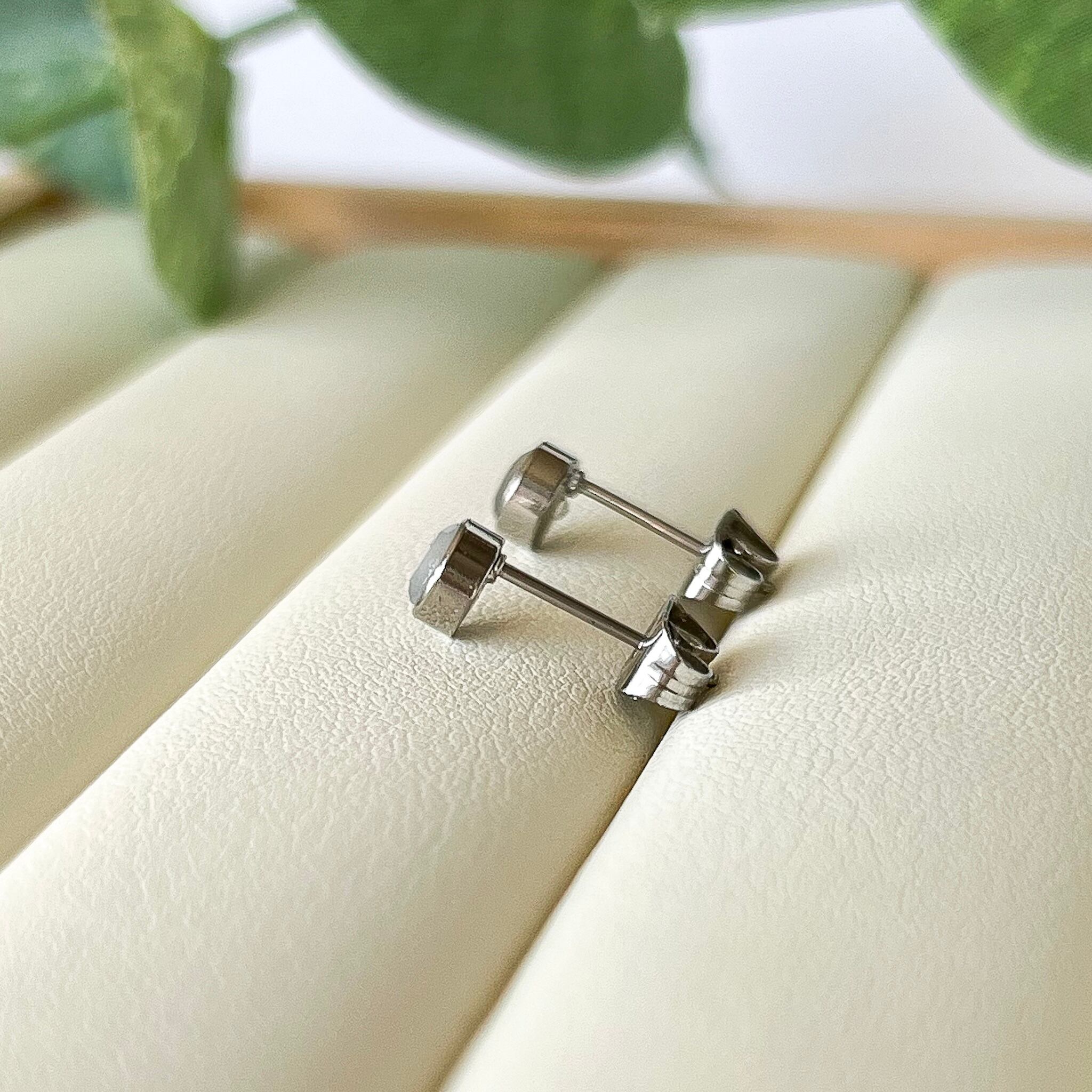 4㎜と小ぶりの天然石をシルバーでぐるりと囲ったべセルタイプのスタッドピアスです。普段使いはもちろん、オフィスやフォーマルまでフレキシブルにご使用いただけます。また引っ掛かりがなく耳にあたる部分もフラットなスタッドピアスですので、ストレスなくお使いいただけます。